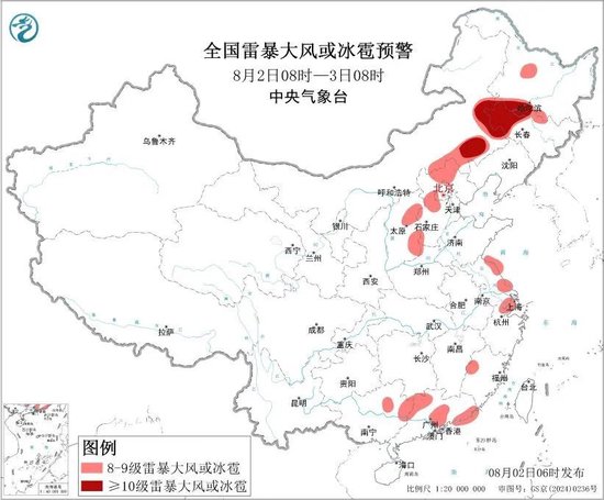 预计8月2日08时至3日08时,内蒙古东部、东北地区西部、华北中西部、江淮东部、华南东部等地的部分地区将有8级以上雷暴大风或冰雹天气,其中,内蒙古东部、黑龙江西南部、吉林西部等地局地将有10级以上雷暴大风,最大风力可达11级以上;内蒙古中东部、东北地区西部、华北中西部、江淮东部、江南东部、西南地区南部、华南等地的部分地区将有小时雨量大于20毫米的短时强降水天气,其中,黑龙江中西部、吉林中西部、天津北部、江苏东南部、广西东部、广东西部等地的部分地区小时雨量大于50毫米,最大可达70毫米以上。